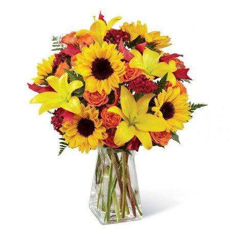 - Selected sunflowers, carnations and premium fresh cut spray roses and lilies arrive perfectly arranged with Italian greenery in a stylish clear glass vase.