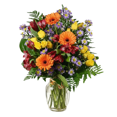 - 3 orange germinis, 3 purple montecasino, 3 yellow spray roses, 3 red alstroemeria